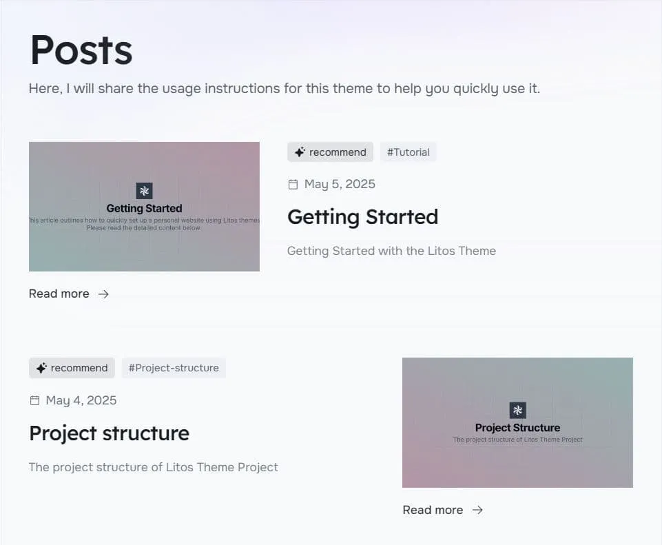 在三个页面上配置您认为合适的样式,当然,您也可以通过在src/components/posts/card中创建自己的卡片文件,并将其导入同一目录下的List.astro来创建自己的卡片样式。