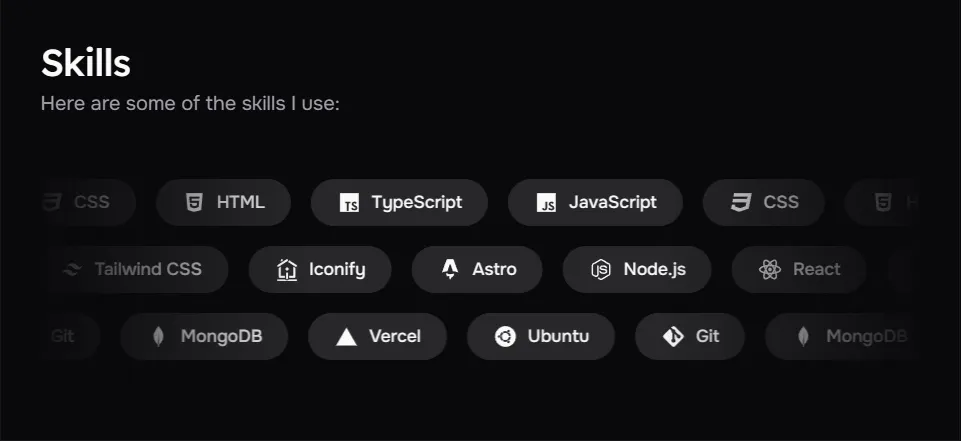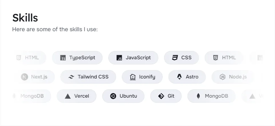 技能显示模块允许您在个人主页上展示您的技术栈和专业技能。通过direction属性,您可以创建具有交替方向的技能组,使页面更加动态和视觉上更具吸引力。每个技能项包含一个名称和一个图标。图标使用Iconify集成,提供数千个可选图标。
