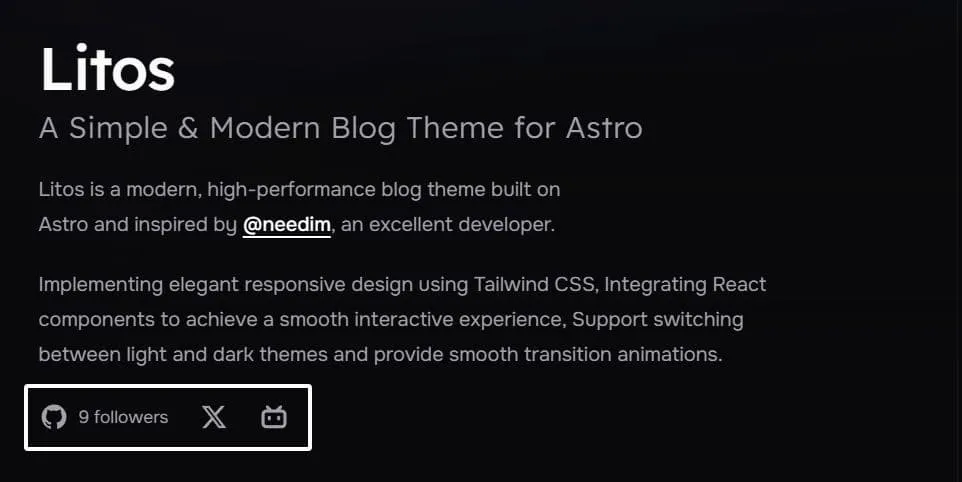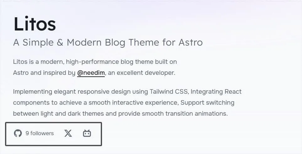Litos包含内置的社交媒体集成功能,允许您展示您的社交媒体存在。社交链接出现在您网站的指定区域: